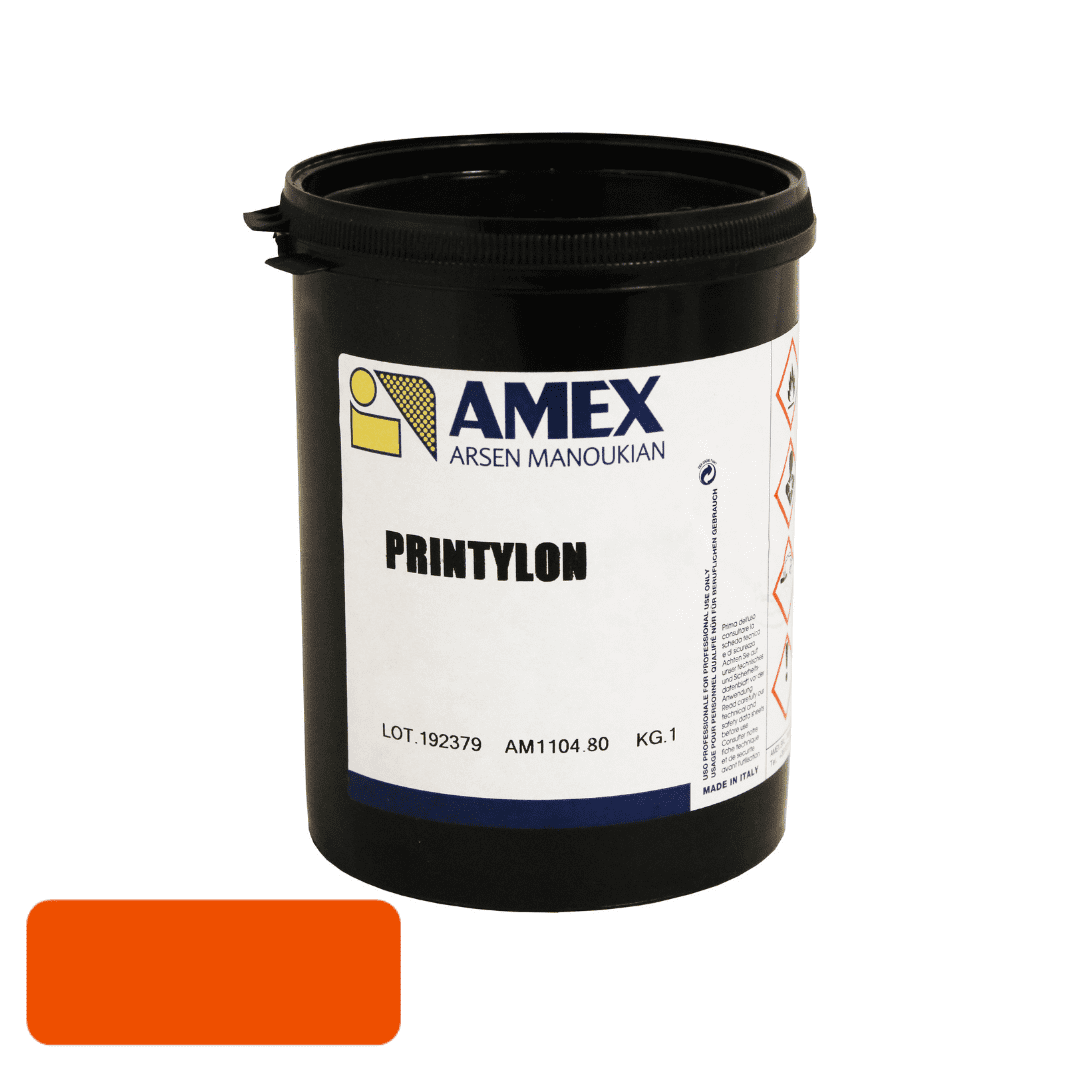 Orange Printylon Screen Printing Ink 1kg Polyurethane semigloss ink suitable for printing onto nylon fabrics, leather, artificial leather, clothing labels, self adhesive treated polyester, EVA, salpha and polyurethane etc. These solvent based inks produce a semi-glossy finishing. They are advised for printing on nylon fabrics, Tyvek bags, fake-leather and water-proofed fabrics. Colours Available: Lemon, Yellow Medium, Yellow, Orange, Scarlet Red, Red, Carmine Red, Magenta, Violet, Ultramarine Blue, Royal Blue, Navy Blue, Intense Green and Black.